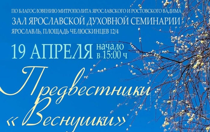 19 апреля 2026 года в Ярославской духовной семинарии пройдет концерт хоровой и вокальной музыки «Предвестники «Веснушки». На концерте выступят: хор ЯГПУ им. К. Д. Ушинского (художественный руководитель и дирижер Юлия Волегова, хормейстер Наталья Теплова), вокально-хоровой ансамбль «ChristAll» (художественный руководитель Алла Марушина). Начало в 15.00. Вход Свободный. Адрес: Ярославль, пл. Челюскинцев, 12/4. Пресс-служба семинарии/Пресс-служба Ярославской епархии