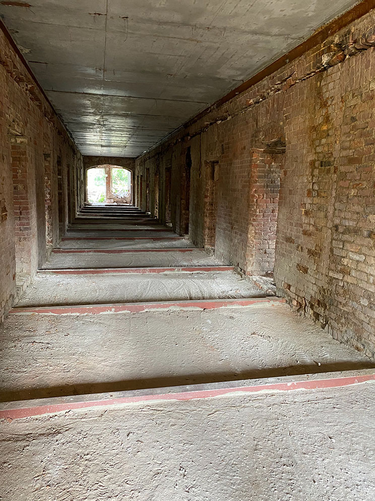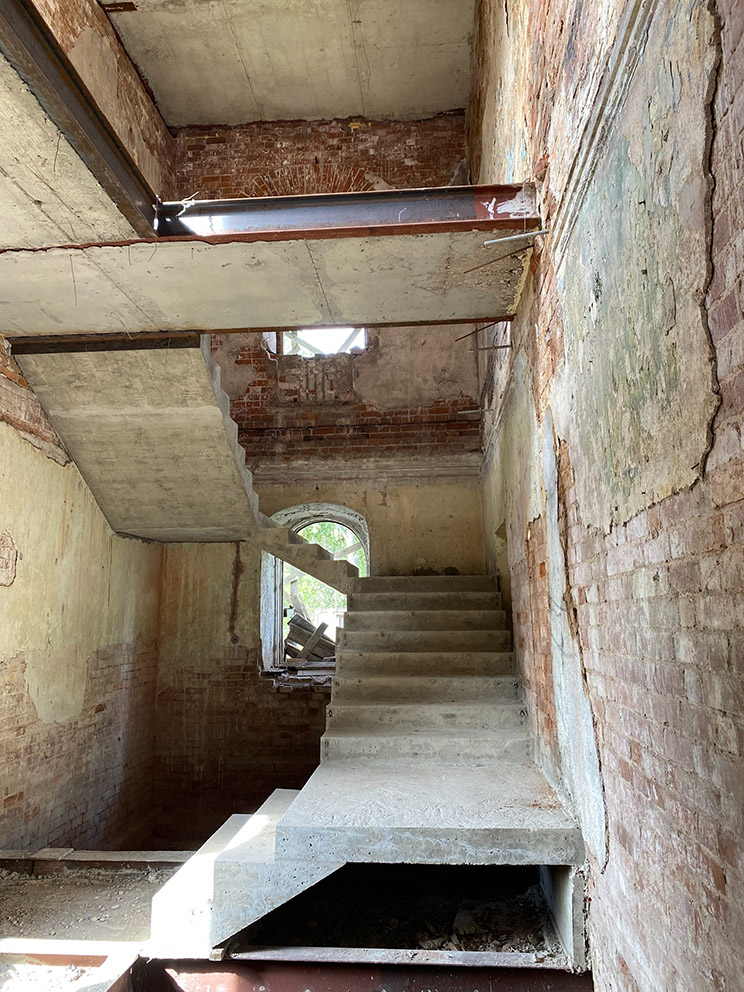За последние два года разрушенное строение богадельни заметно преобразилось. Были проведены капитальные работы по возведению перекрытий между этажами и крышей, по устройству лестничных конструкций. Этим летом бригада рабочих проводила вычинку кирпичной кладки карниза и другие подготовительные работы, необходимые для возведения крыши.
