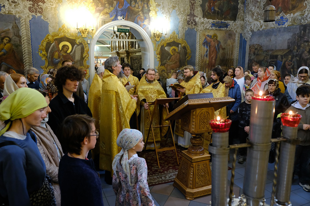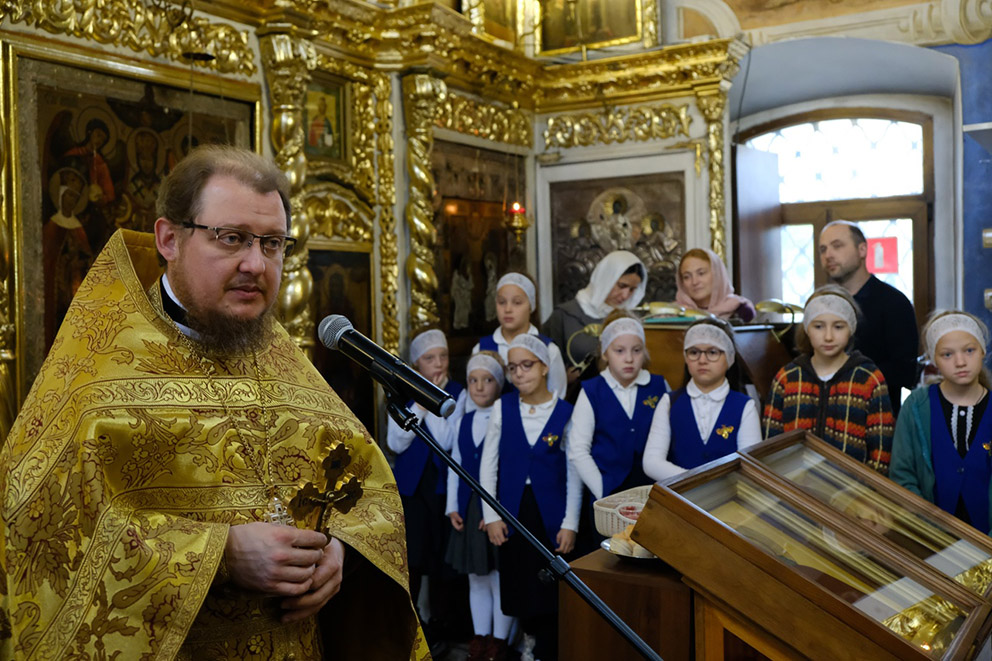 На клирос поднялся детский хор. Воспитанники Школы пономарей помогали священнослужителям в алтаре. Юные волонтеры следили за подсвечниками и лампадами. Возглавил богослужение настоятель прихода протоиерей Алексий Кириллов.