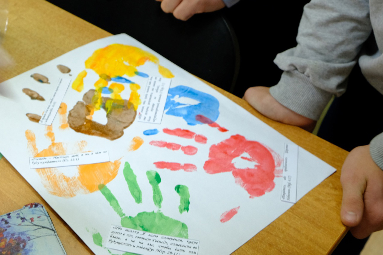 Наступил самый трогательный момент. Дети создавали цветные отпечатки своих ладоней. А мы помогали им в этом. Чувства переполнили душу, когда мы вместе наносили краски на кисти их рук и оставляли оттиски на листе бумаги. А после размещали на них Библейские изречения, которые дети сами выбрали. Получились замечательные плакаты. Так творчество дало нам возможность оставить ребятам на память что-то по-настоящему важное. Это частичка надежды, веры и любви, воплощенная в их собственном уникальном прикосновении.