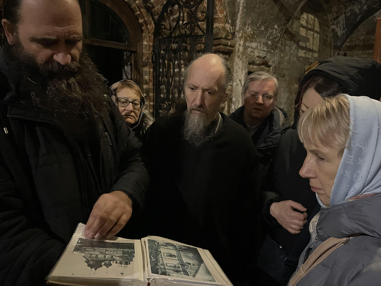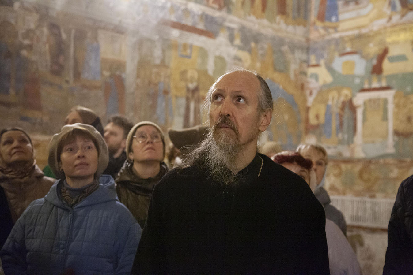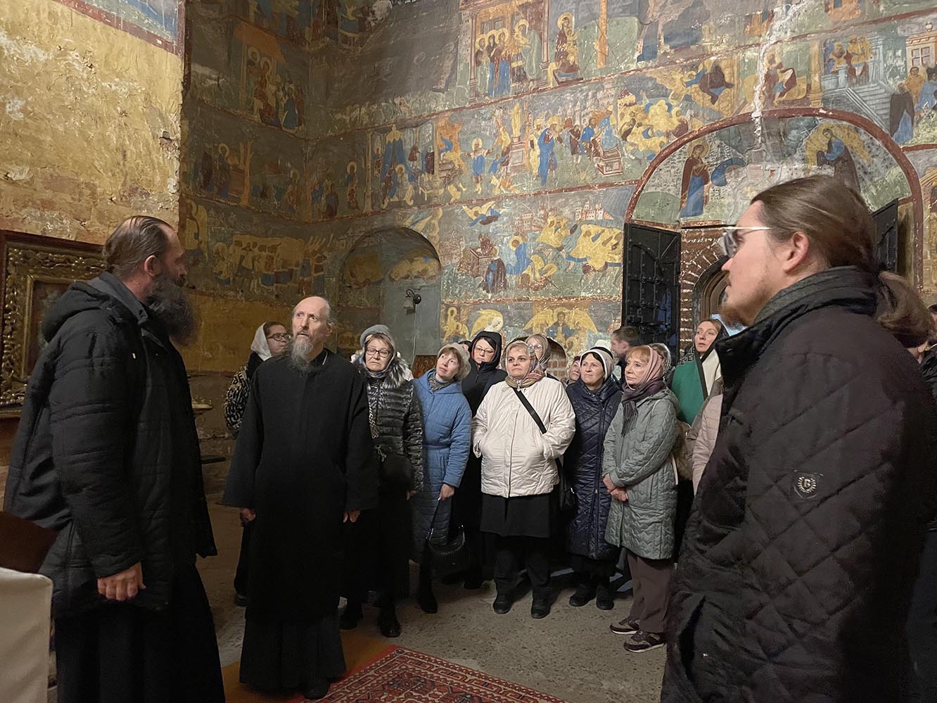 После Успенского собора гости посетили храм Спаса на Городу и Михайло-Архангельский храм. Экскурсию по летнему Михайло-Архангельскому и зимнему храму провел настоятель иерей Евгений Волков. Стенопись храма выполнила в 1731 году артель ярославских изографов во главе с Фёдором Фёдоровым. Эта работа характерна для позднейшей ярославской фресковой живописи. Отец Евгений показал паломникам изображения храма до революции, фотографии, запечатлевшие разрушения в результате Ярославского восстания.