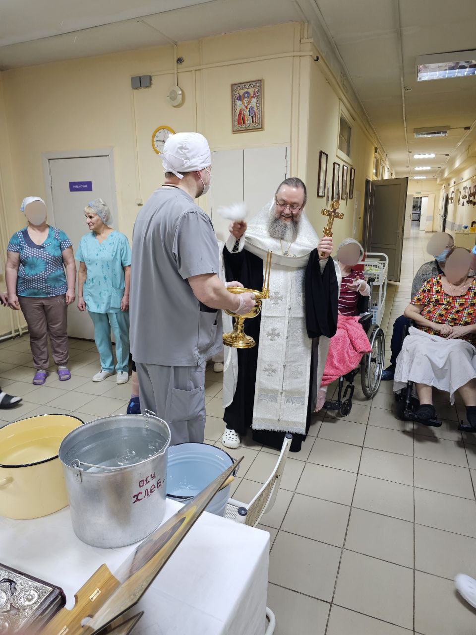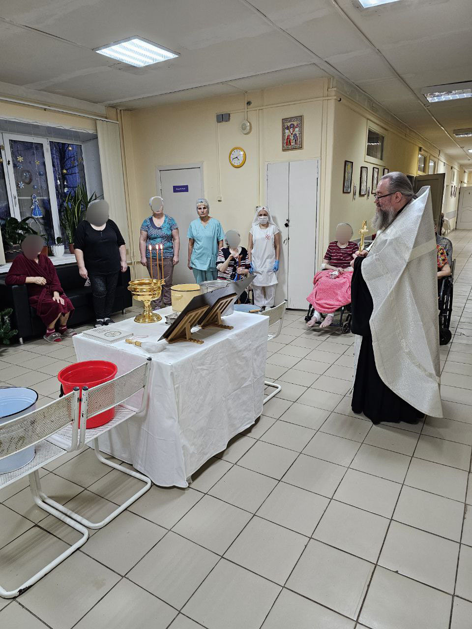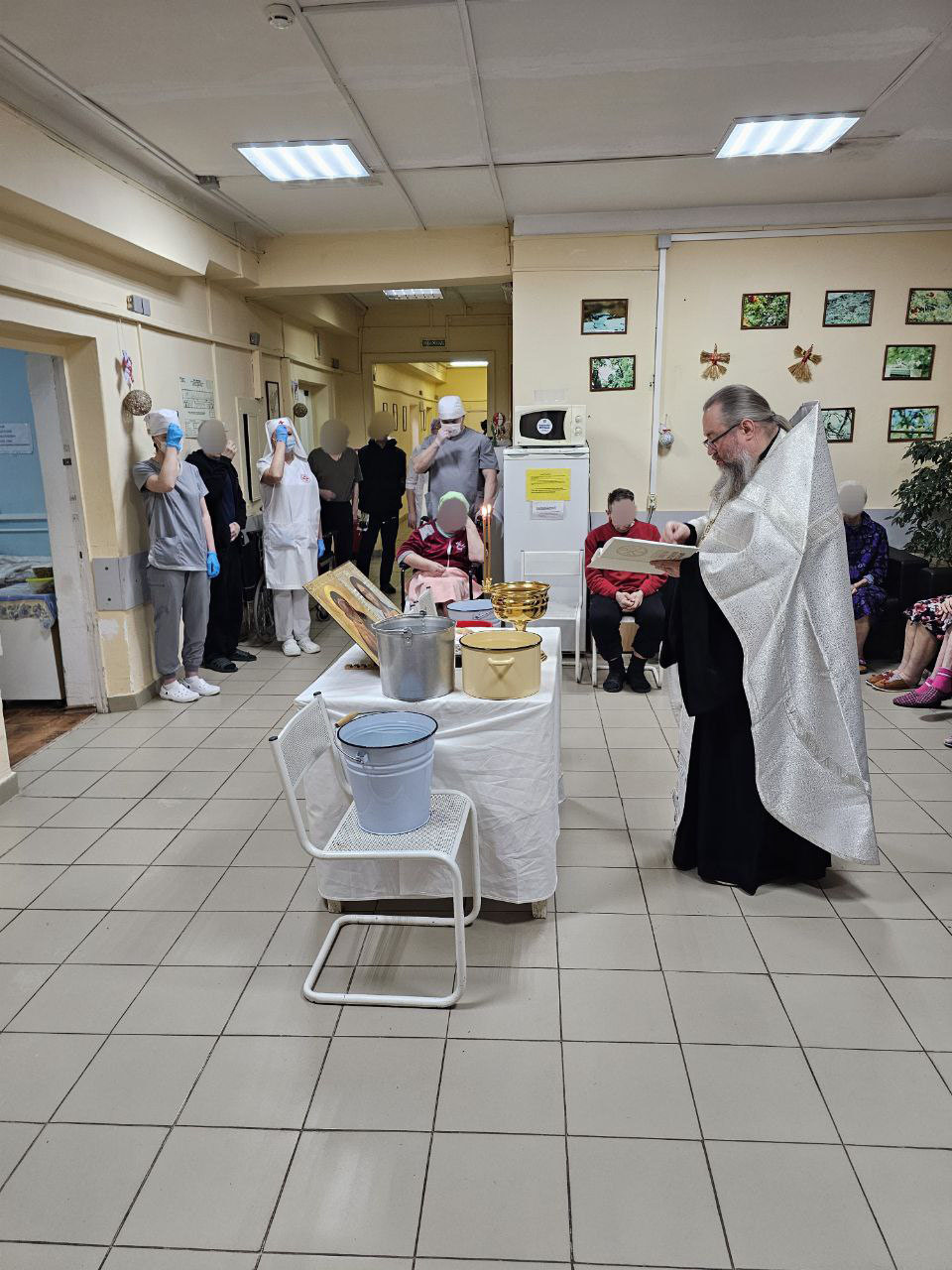 На богослужение также были доставлены пациенты Отделения сестринского ухода. Крещенское водоосвящение стало уже доброй традицией для больницы им. Семашко. После водосвятия отец Агафангел рассказал о значении праздника Крещения Господня и окропил всех пациентов святой водой.