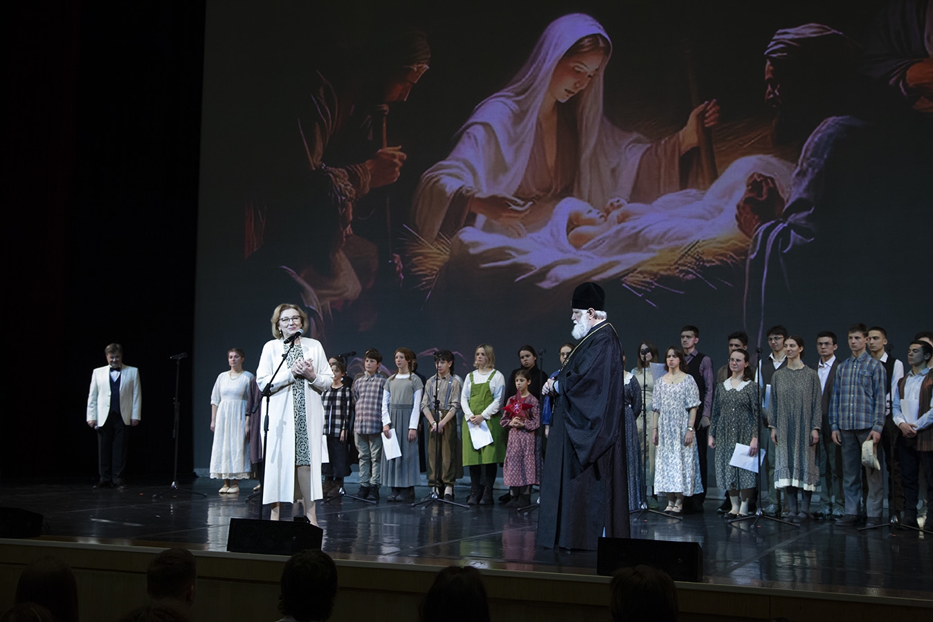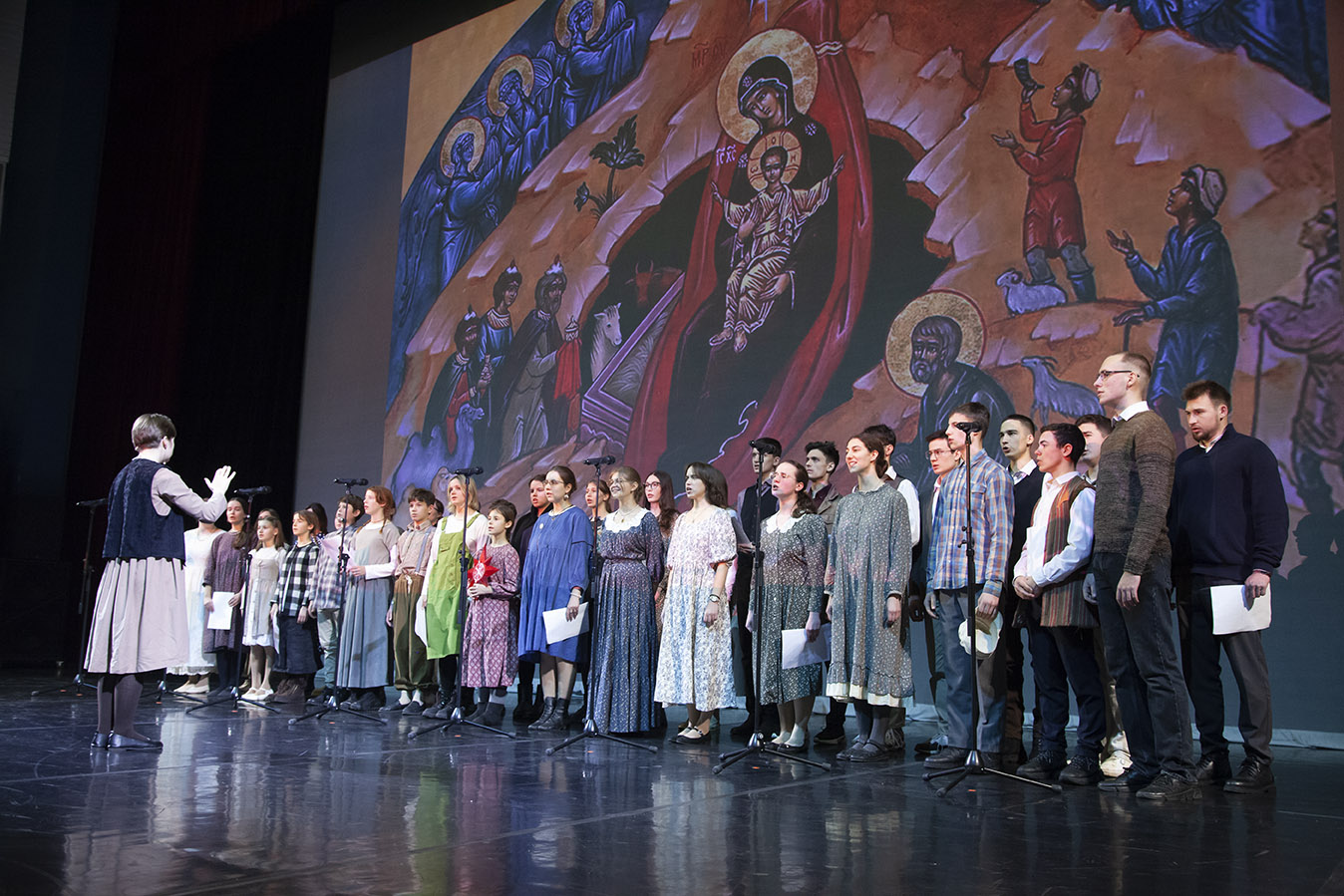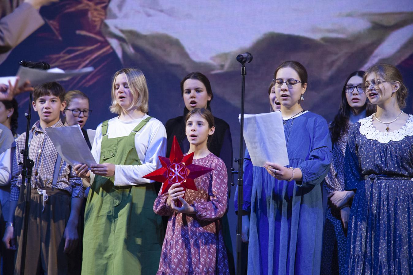 Концертную программу продолжил хор молодежного движения Рыбинской епархии «Преображение» с юными чтецами учебного театра «Надежда» Ярославского детского экологического центра «Родник» с музыкально-литературной композицией «Рождество Христово».