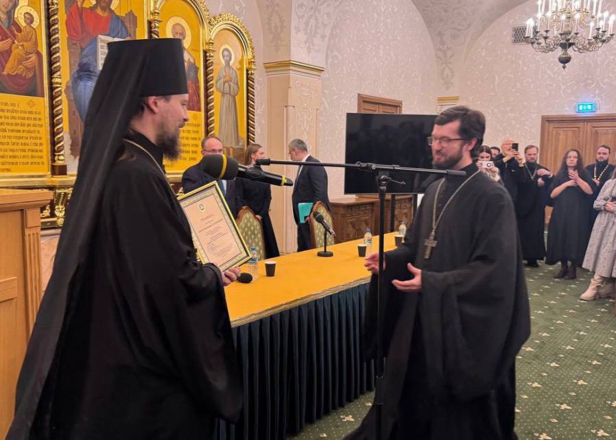 Грамоту отцу Александру вручил заместитель председателя Синодального отдела по религиозному образованию и катехизации игумен Иоанн (Рубин).