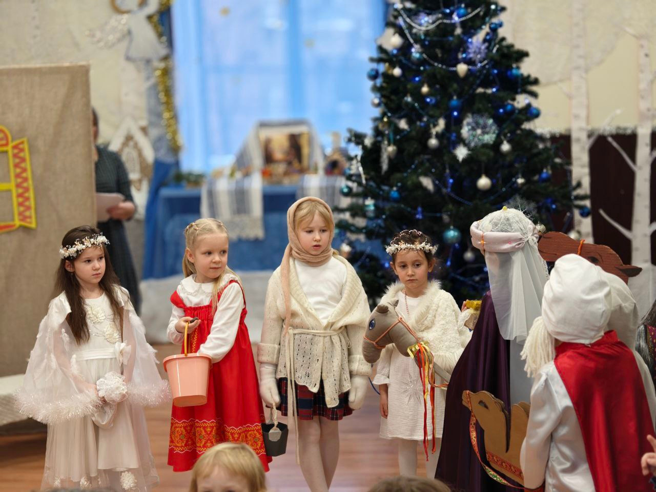 В конце Рождественского утренника дети показали всем чудесную, поучительную сказку про двух сестриц — Настеньку и Марфу, которым пришлось пережить бок о бок настоящее приключение в сказочном мире. Помогали им их ангелы-хранители и святитель Николай. Это сказка о человеческих добродетелях и грехах, об испытаниях и покаянии, о Том, Кто однажды изменил весь мир.