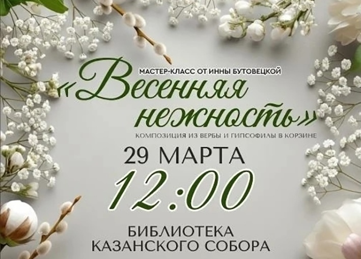29 марта 2026 года в библиотеке Казанского собора Казанского женского монастыря г. Ярославля пройдет мастер-класс «Весенняя нежность» по составлению композиции из вербы и гипсофилы в корзине.