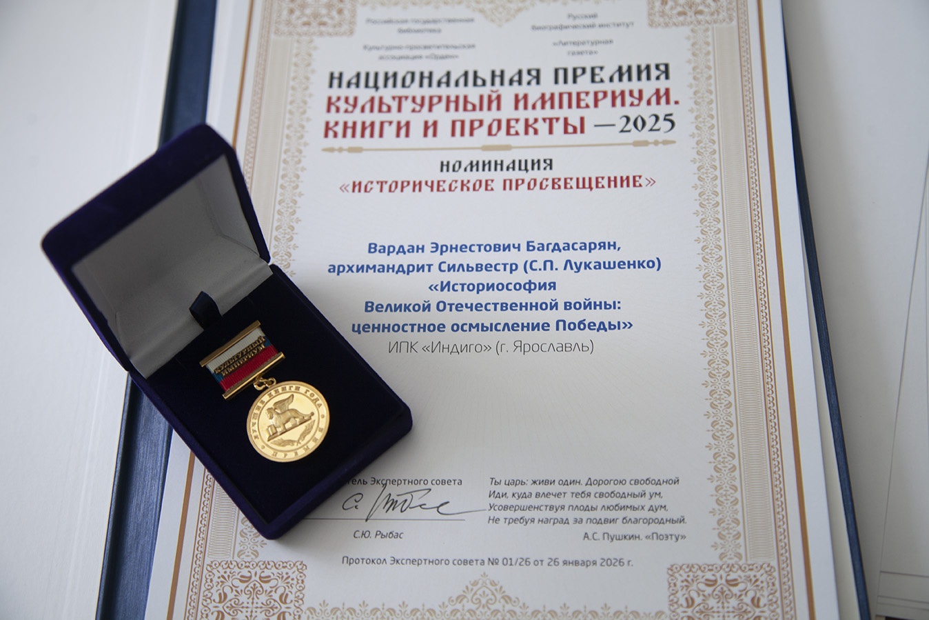 17 марта 2026 года в Центральном доме литераторов состоялось вручение Национальной премии «Культурный империум. Книги и проекты». Эта премия была основана в 2000 г. Российской государственной библиотекой, «Литературной газетой» и др. просветительскими организациями. В этом году победителями в номинации «Военная история» стали декан Государственного университета просвещения В. Э. Багдасарян и председатель Церковно-исторического общества Ярославской епархии архимандрит Сильвестр (Лукашенко) за книгу «Историософия Великой Отечественной войны: ценностное осмысление Победы» (научный редактор профессор, эксперт ОМЦ ЯрГУ Юрий Иерусалимский).